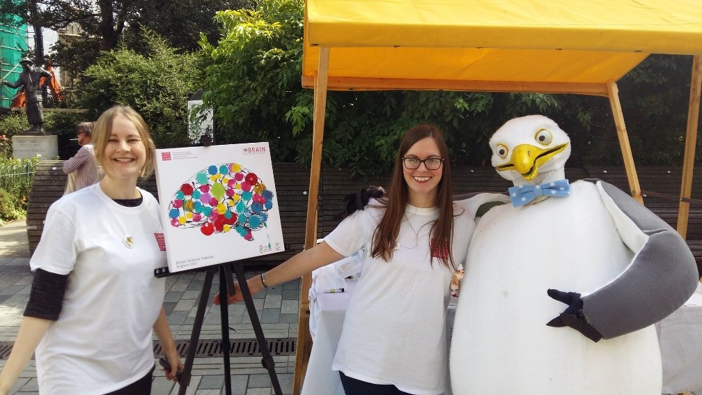 In September I was part of a team who went to the British Science Association Festival 2017 in Brighton to promote the neuroscience research that Cardiff University is doing. Along with Rachel Smith from the communications team in the Neuroscience and Mental Health Research Institute. Together we ran a ‘splodge the brain’ activity to explain to children and families about the importance of different brain regions and what might happen if they go wrong. We had over 200 people visit the stand and even the local ‘science seagull’ was keen to take part in our activities.