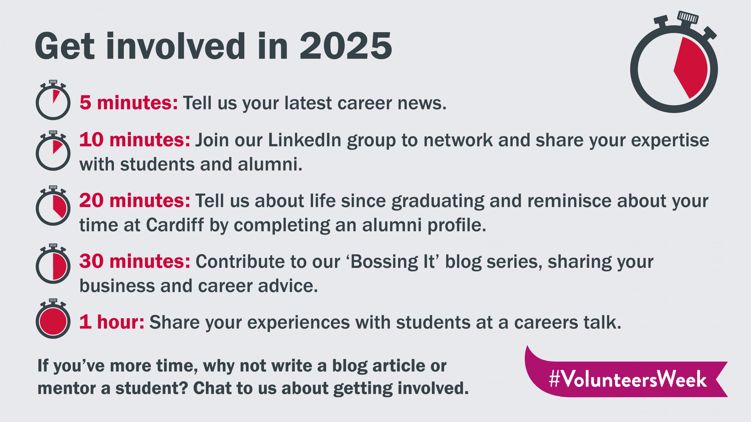 We want to take this time to say a special thank you to all of our alumni volunteers who are instrumental in making a difference here at Cardiff University.