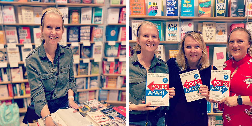 Fe wnes i ymuno â dau gydweithiwr o Which? ac fe wnaethom lansio podlediad o’r enw Changed my Mind, a gynhaliwyd gan Open Democracy, yn gofyn i arweinwyr o fyd busnes, y byd academaidd a gwleidyddiaeth am adeg pan oeddent wedi newid eu meddwl i hyrwyddo meddwl agored, myfyrio a mwy o oddefgarwch. Yn dilyn llwyddiant y podlediad cawsom gytundeb byd eang gyda Penguin Random House i ysgrifennu llyfr ar pam y gall grwpiau droi yn erbyn ei gilydd a sut i ddod â phobl yn ôl at ei gilydd. Er ein bod wedi newid swyddi, cafodd un ohonom fabi, ac wrth gwrs y pandemig byd-eang, cyhoeddwyd Poles Apart ym mis Medi 2021 gyda chymeradwyaeth wych (rwy’n dal i fethu credu’r peth).