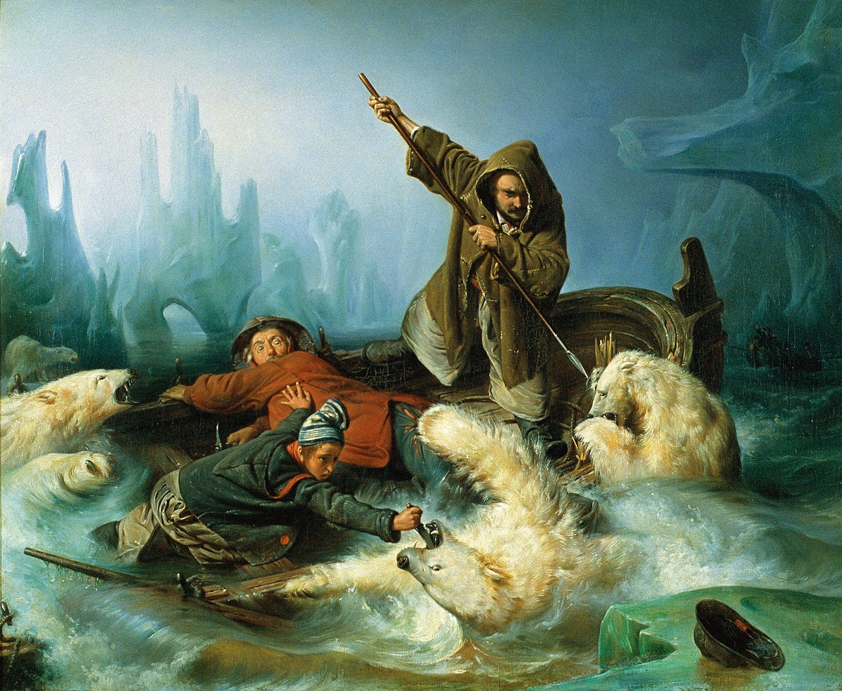 Polar bears have been a subject of visual representation for at least two millennia. In prehistoric artifacts by Dorset makers across Greenland and the Canadian Arctic, the polar bear is the most common non-human motif. Dorset carvings—miniatures made of materials like bone, ivory, and soapstone—depict polar bears frozen mid-hunt as though stalking, swimming toward, and pouncing on their prey. From Renaissance maps to engravings, paintings, and panoramas in the modern period, polar bears appear as symbols of majesty and mystique, of strength and survival, of danger and death. They were a point of fascination for European artists, some of whom traveled to the Arctic alongside explorers and scientists or observed them in captivity at zoological gardens, while others drew from existing textual and visual documents and their own polar fantasies.