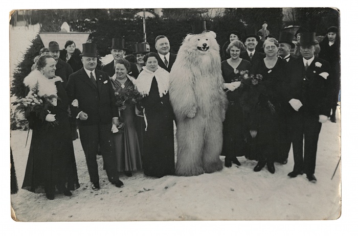 The French Coca-Cola print ad came as polar bear imagery was thriving in fine art, popular culture, and entertainment. French artist François Pompon was producing a series of polar bear sculptures, the first of which—a life-sized plaster rendition—was exhibited at the Salon d’Automne in 1922 (1). Meanwhile, neighboring Germany was swept by a polar bear craze. On the streets, on the beach, and in the snow, children, families, and soldiers were posing for photographs with actors in polar bear costumes. The furry and friendly bears hug and hold hands with their human counterparts in these surreal snapshots. Bizarre and amusing, the pictures are also haunting—entangled with the social and cultural life of interwar Germany.