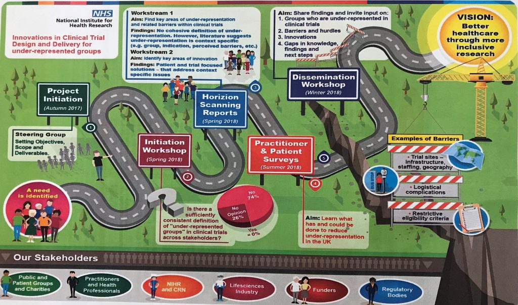 During the past year, a project looking at innovations in clinical trials design and delivery for under-represented groups has been carried out by a group of researchers at Newcastle University as part of a NIHR CRN speciality cluster, and supported by the NIHR Innovation Observatory. The project consisted of two horizon scanning reviews, a practitioner and patient survey, and engagement with a range of stakeholder groups. A Steering Group was involved in setting the objectives, scope and deliverables.
