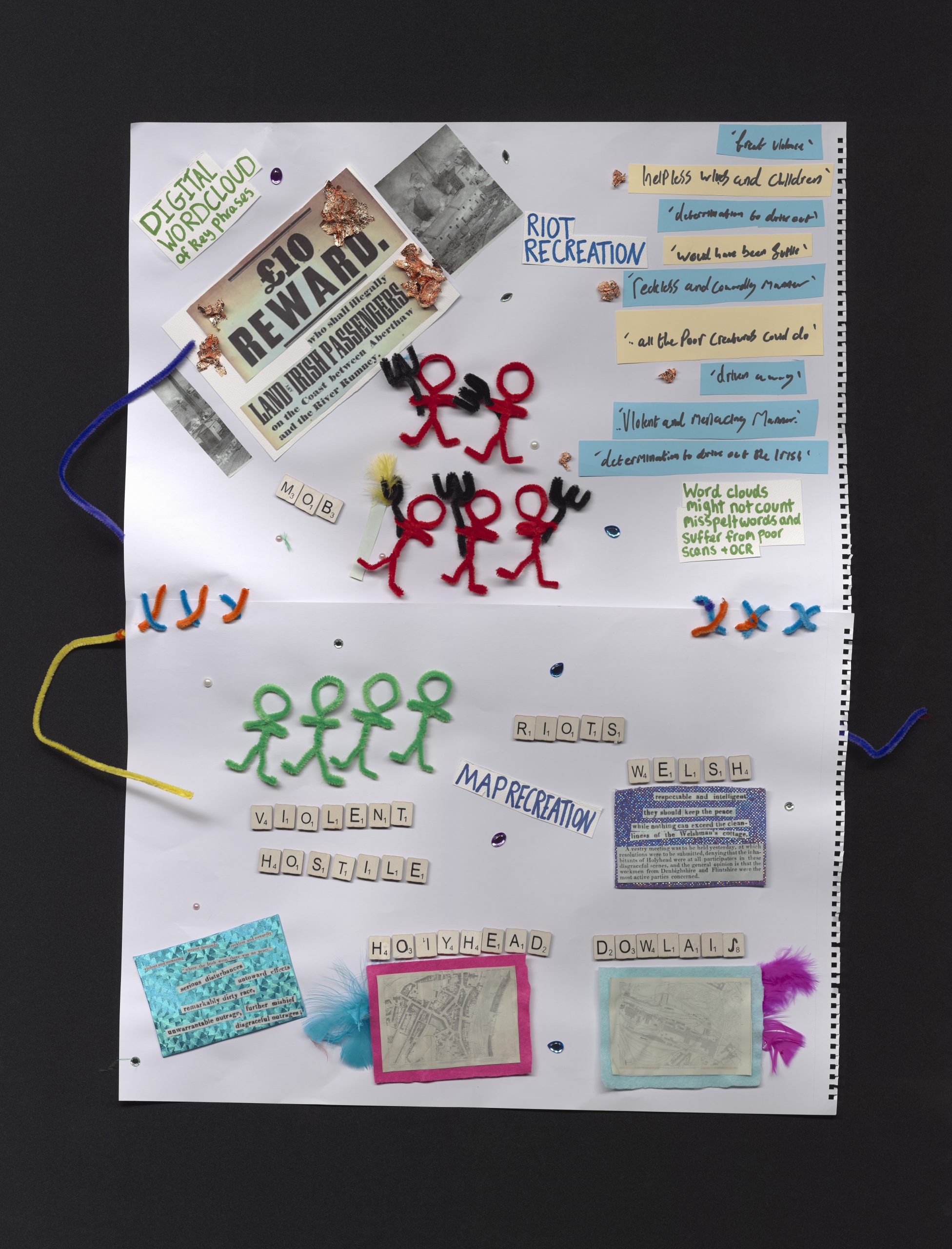 This group focused on how digital methods could enhance the initial research process. They explored how optical character recognition (OCR) software could be used to scrape contents of 19thC Welsh newspapers reporting on contemporary anti-Irish riots to draw out patterns and comparisons in the discourse of regional reporting. The group gave particular thought to which materials they used in the poster, keen to emphasise textures and depth in their final digitised copy. The pipe cleaners and rose-gold foil certainly achieve this aim!
