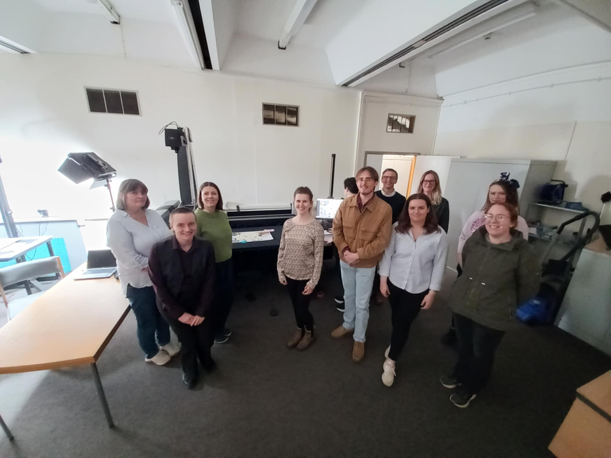 The following day, at Special Collections, both groups were given detailed and informative demonstrations of the digitisation process by digital archivist specialists, Alison Harvey and Sarah Hayton. Each poster was scanned using Special Collection’s 3D digital scanner. The resulting images were used to demonstrate the quality of the equipment and the art of digitisation – the skill of capturing the materiality and ‘aura’ of the original physical object for digital audiences to appreciate and enjoy.