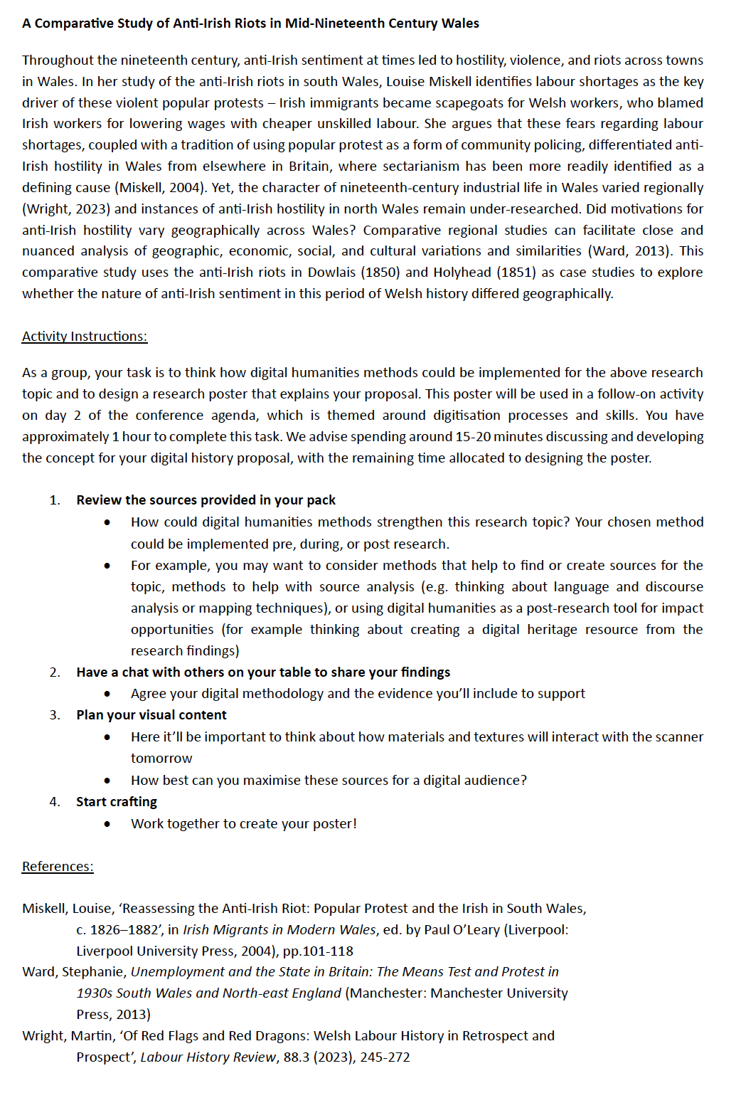 We wanted delegates thinking creatively about how digital tools can enhance historical research, what challenges exist, and how these benefits and challenges could be communicated to a wider audience. To pack these big ideas into a 60-minute session in a fun and collaborative manner, we developed a research poster crafting activity: split into groups and equipped with pre-prepared Welsh history research topics, delegates would design a research poster using nostalgic craft materials. These would capture their ideas about how to implement digital methods within their allocated topic. The posters would then be used as samples for the following day’s digitisation session.