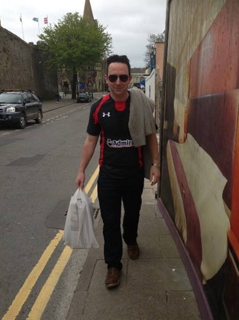 On Hefin’s ‘Hag’ do in Tenby, Sally had the genius idea (which I operationalised) of all dressing up as Hefins, with his black rimmed glasses, carrier bag and towel (a Welsh flag of course) slung over our shoulders. Behold, his amazing reaction as he reached the top of our upside-down house rental stairs to see us all in our Hefin glory.