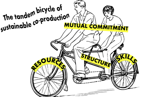 Co-production is a tandem bicycle where the core spine of the bike is ‘structure’. The operations management behind the co-productive relationship, aka ‘things that lean is good at’ e.g. standardised meeting formats, facilitative workshops, standard management routines. Basically, how the co-production happens in practice.