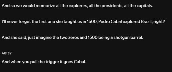 One of these delights is Jerry’s ability to quote reams of relevant text from different authors as he draws on the parallels between Taylor’s work and Charles Dickens, or Emily Dickinson. Angela can do this too, but for Taylor Swift songs! I binged all of the episodes over the Christmas break and one of them gave me an idea for a blog. It was actually an episode that was a bonus chat, not a song analysis, but Dr Uncle Jerry talked about how he had been incentivised to memorise poems, a dollar a time, by his Grandmother. This had impressed upon him the usefulness of being able to quote texts, initially for his financial gain, then for teaching, and now for Taylor Swift podcasts. He explained that he was assisted in this endeavour by one of his teachers “Mrs Martin” who had taught him the power of using mnemonics to help him to memorise things.
