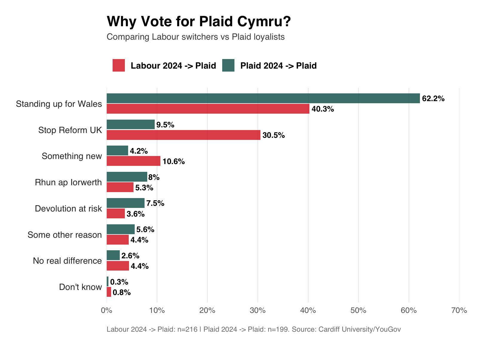 For Plaid Cymru, the contrast between Labour switchers and Plaid loyalists is stark but common themes emerge. People switching from Labour are heavily motivated by tactical considerations: 30.5% cite “They are best placed to stop Reform UK” compared to 9.5% of Plaid loyalists. This suggests a significant portion of Labour’s former vote is consolidating behind Plaid for defensive reasons rather than positive enthusiasm for Plaid itself. Yet Labour switchers aren’t purely tactical. Even more Labour switchers (40.3%) cite “standing up for Wales” as their primary motivation. This is an issue which Welsh Labour have arguably ‘owned’ for the entire devolution period, making the recent collapse in perception on this issue all the more remarkable. This combination indicates that Plaid’s consolidation of the Welsh-identifying progressive bloc combines defensive tactics with genuine belief that Plaid better represents Welsh interests.