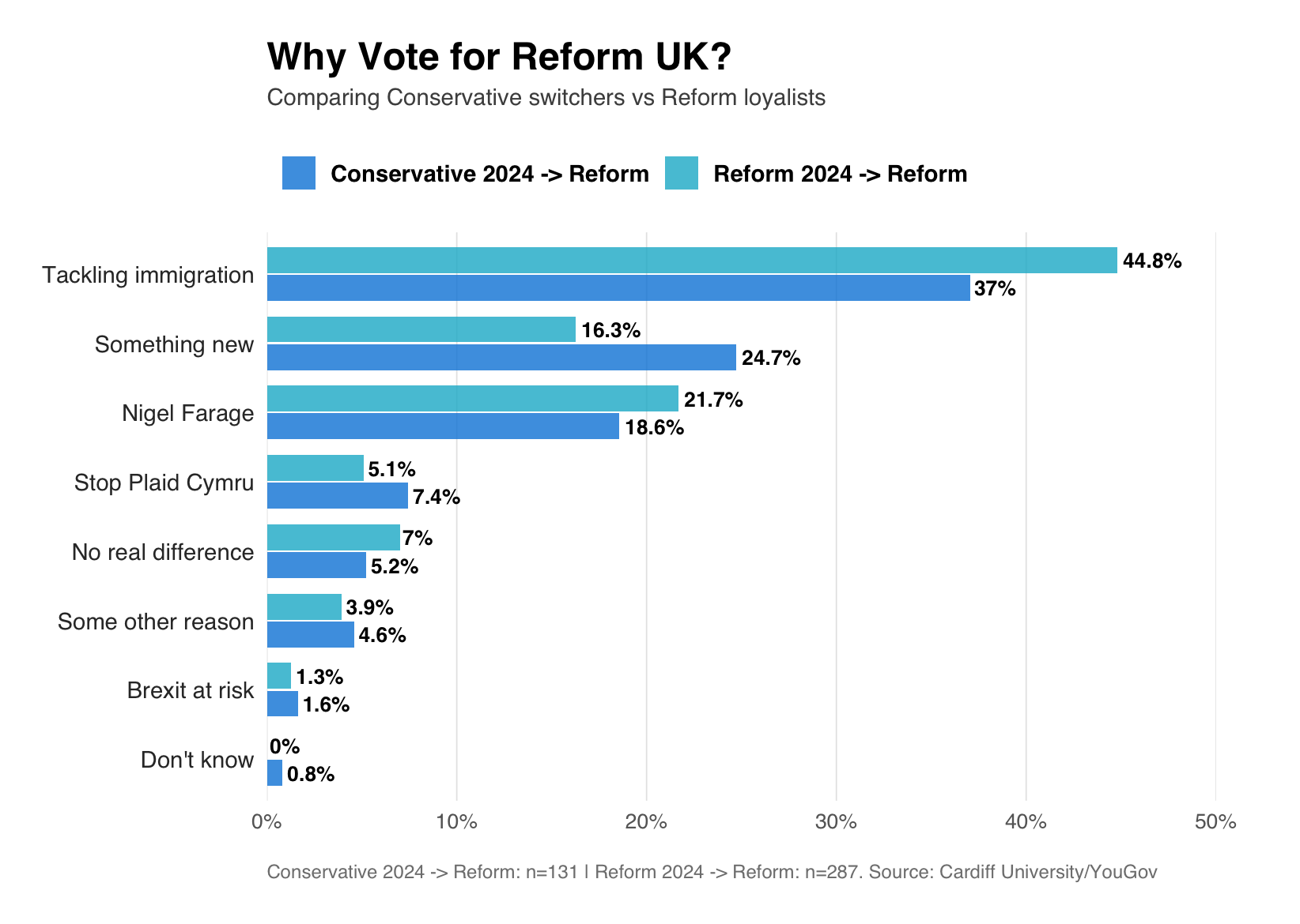 Reform UK switching shows a different pattern. Conservative switchers are significantly more likely to select protest motivations: 24.7% choose “something new” compared to 16.3% of Reform loyalists. Immigration remains the dominant issue for both groups (Conservative switchers 37%, Reform loyalists 44.8%), but the gap suggests loyalists are more ideologically committed while recent switchers include a substantial protest component. Leadership matters more for Reform than Plaid. Nigel Farage registers strongly among both Conservative switchers (18.6%) and Reform loyalists (21.7%), underlining the extent that his personal brand is central to the party’s appeal.