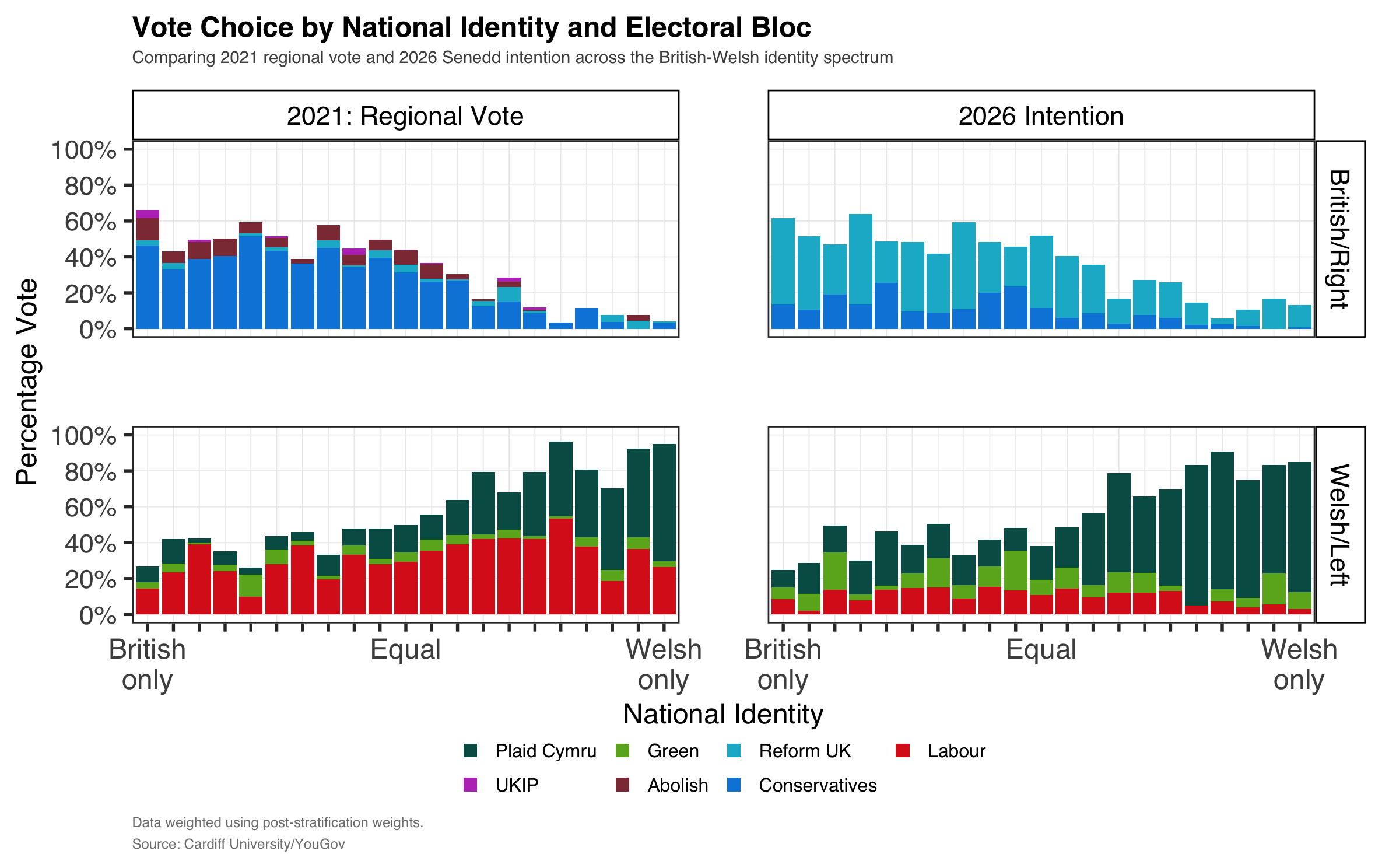 This creates a bifurcated realignment with different mechanisms on each side. Reform’s consolidation of the British-identifying right reflects British politics playing out in Wales. Plaid’s consolidation of the Welsh-identified left reflects Welsh politics asserting autonomy within the devolved electoral context.