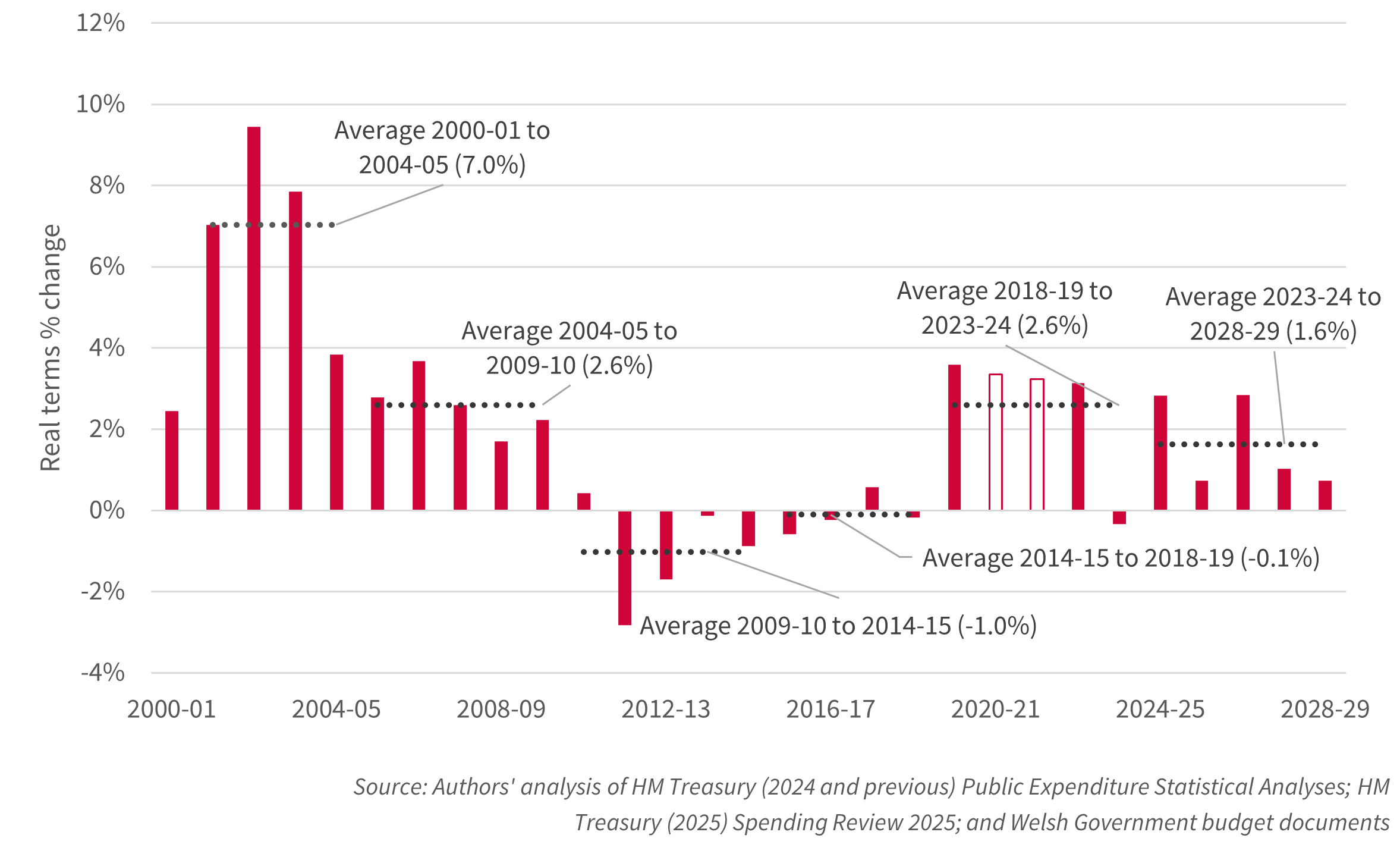 Figure 1: Average annual change in Welsh Government day-to-day spending, 2000-01 to 2028-29