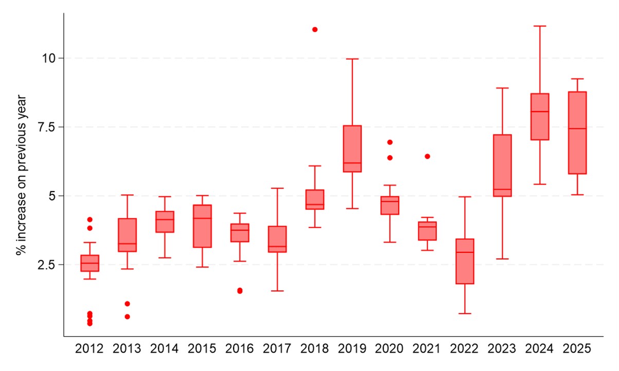 As we’re currently in the middle of the five-year local government election cycle (2022-2027), this shouldn’t be surprising. Figure 1 shows Band D council tax increases by depicting the range of increases enacted across the 22 local authorities. There’s sufficient evidence now that Council Tax increases are higher in the middle of local government electoral cycles and lower during election years (2012, 2017, and 2022).