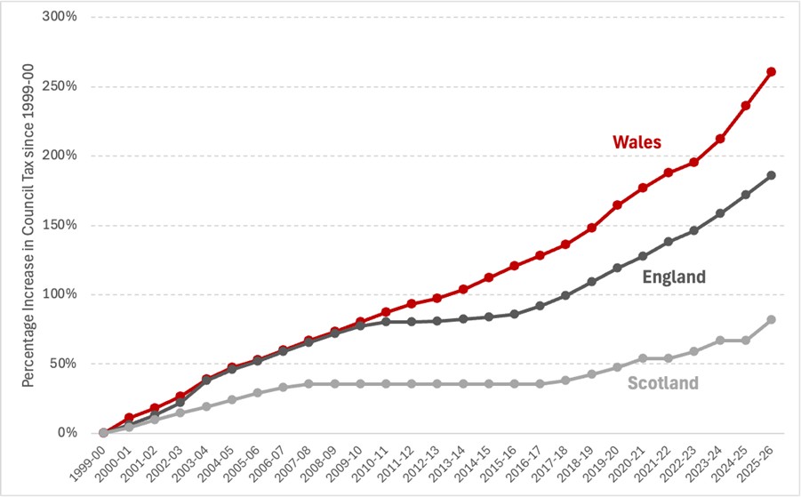 - Wales is the UK outlier: Since devolution in 1999, Welsh council tax bills have effectively tripled in nominal terms. Wales has averaged annual increases of 5%, compared with 4% in England and just 2% in Scotland